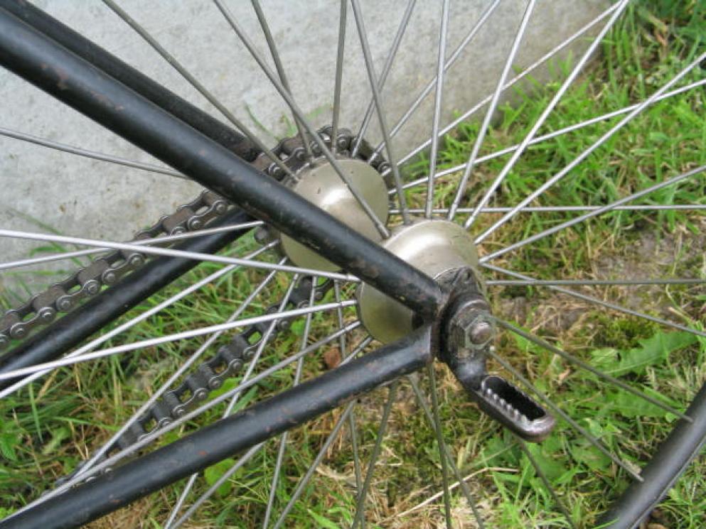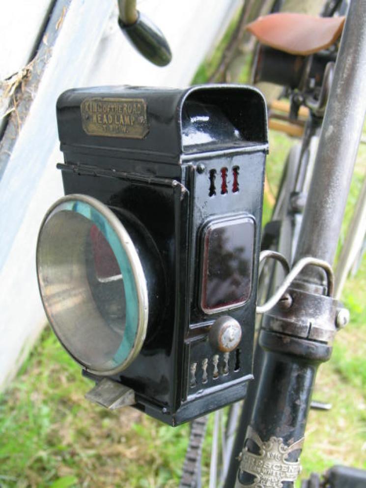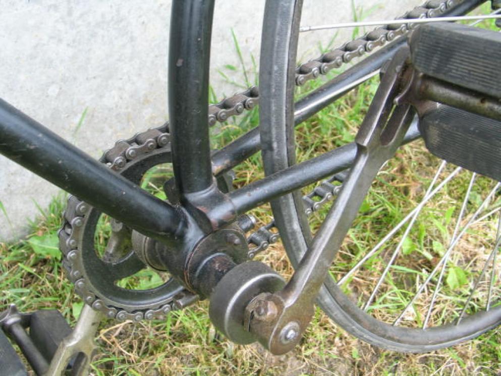 Very interesting is the eccentric bracket, meant to adjust the chain. We see this moreoften on British bicycles from the 1900-1915 period, but it's quite rare on safeties. I also love the Lucas King of the Road lamp. It's a pity the mudguards are missing, but you can't have it all. The badge attached looks quite right, but this bicycle is really a Crescent nr. 1, not a Crescent nr. 15.